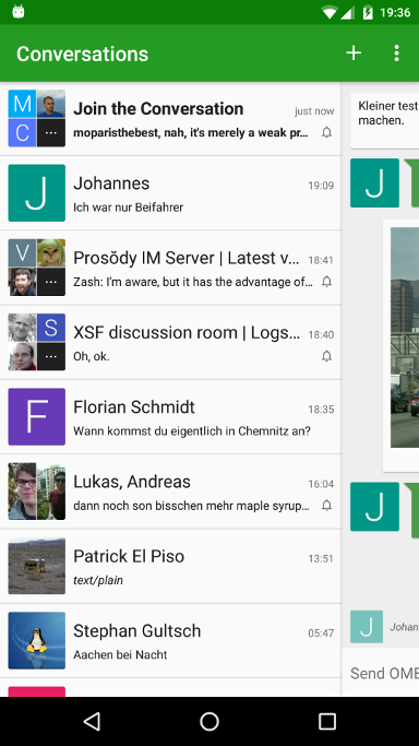 Conversations stellt ebenfalls eine großartige Basis dar, um deinen eigenen Sofortnachrichtensenderfür deine Kunden und Mitarbeiter zu erstellen. Falls du nicht die Zeit und Ressourcen hat, dies selber zu tun, kannst du den Hauptentwickler Daniel Gultsch beauftragen/(nicht mieten), um die perfekt angepasste Lösung zu bekommen./erstellen, die du brauchst.