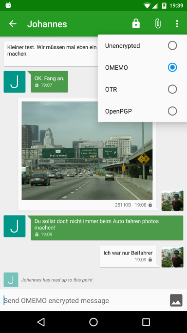 Als besonderes Extra bietet Conversations die Möglichkeit, aus verschiedenen Ende-zu-Ende-Verschlüsselungen zu wählen. Die aktuellste und wichtigste heißt OMEMO, die nach aktuellen Maßstäben sicherste "Muli-Ende-zu-Multi-Ende"-Verschlüsselung, die sehr einfach einzurichten ist. Zudem bietet diese Art der Verschlüsselung die sog. "vorwärts gerichtete Geheimhaltung" und die "plausible Abstreitbarkeit", welche für eine vertraulichen Datenaustausch elementar wichtig ist.